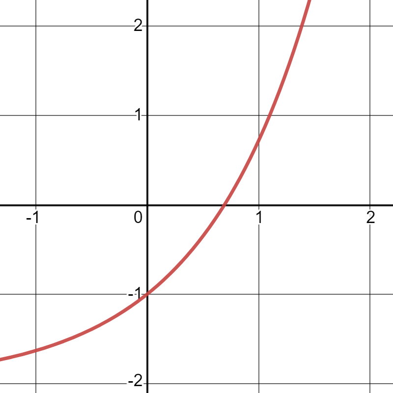Find the area bounded by the curves \(f(x)=e^x-2\text{,}\) the \(x\)-axis, \(x=0\text{,}\) and \(x=1\text{.}\)